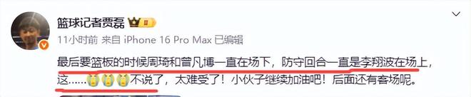 为什么在最后20秒中国队连续丢了三个篮板?这完全是郭士强的昏招所致。他奇葩地撤下高大中锋,换上最矮的内线李祥波,结果没人保护篮板,郭士强真是太昏了。对此,篮球记者贾磊痛苦地说,“最后要篮板的时候周琦和曾凡博一直在场下,防守回合一直是李翔波在场上,这……不说了,太难受了!”贾磊表达的意思,此刻不应该上李祥波,而是让周琦或曾凡博放在场上,这样或许就不会连丢三个篮板了。