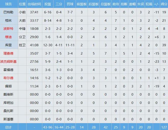 勇士那边,库里出手30次中12球,其中三分11中4,罚球11中11空砍39分,追梦格林铁树开花贡献21分,巴特勒16次投篮只换回19分。