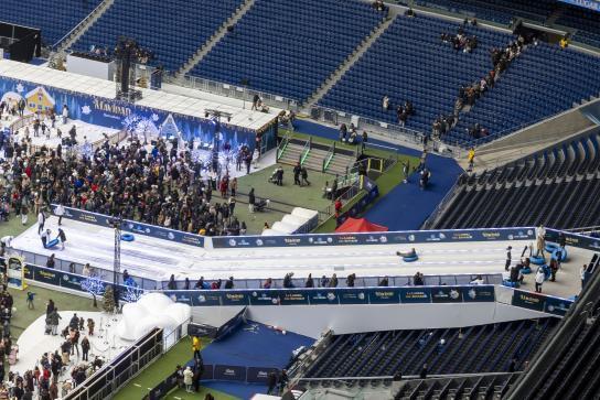 在球场内,孩子们可以乘坐专为此次活动打造的全白色旋转木马,参与讲故事和面部彩绘活动,甚至还能从球场的一处看台上乘坐雪橇滑下——那里已搭建起一座巨大的斜坡。此外,在这些游乐设施周围还设有一个小型集市,中央摆放着一个巨大的雪球,家庭成员们可以在此休息,并享用各类美食,如热巧克力配吉事果、国王饼、披萨或汉堡等。