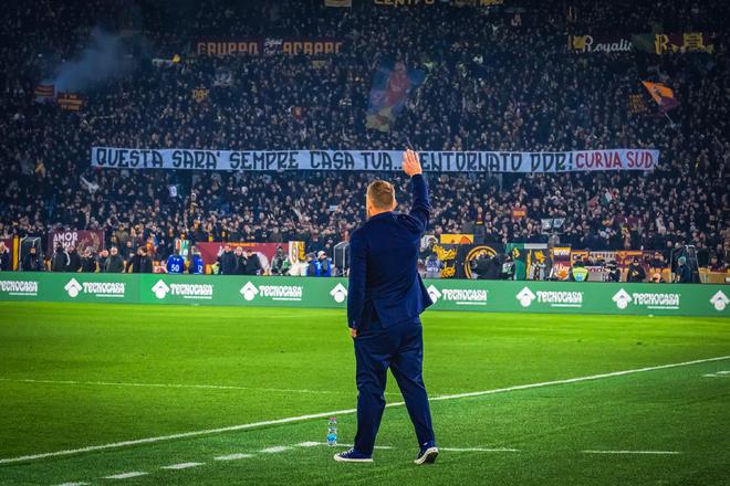 德罗西看到这些横幅也颇为感动,他多次向看台鼓掌并亲拍自己的胸口,表达对于罗马球迷的感谢。即便热那亚连丢两球,球迷仍高唱那首熟悉的德罗西专属助威歌曲。终场哨响,德罗西绕场致意,再次感谢了罗马球迷对于自己的认可。