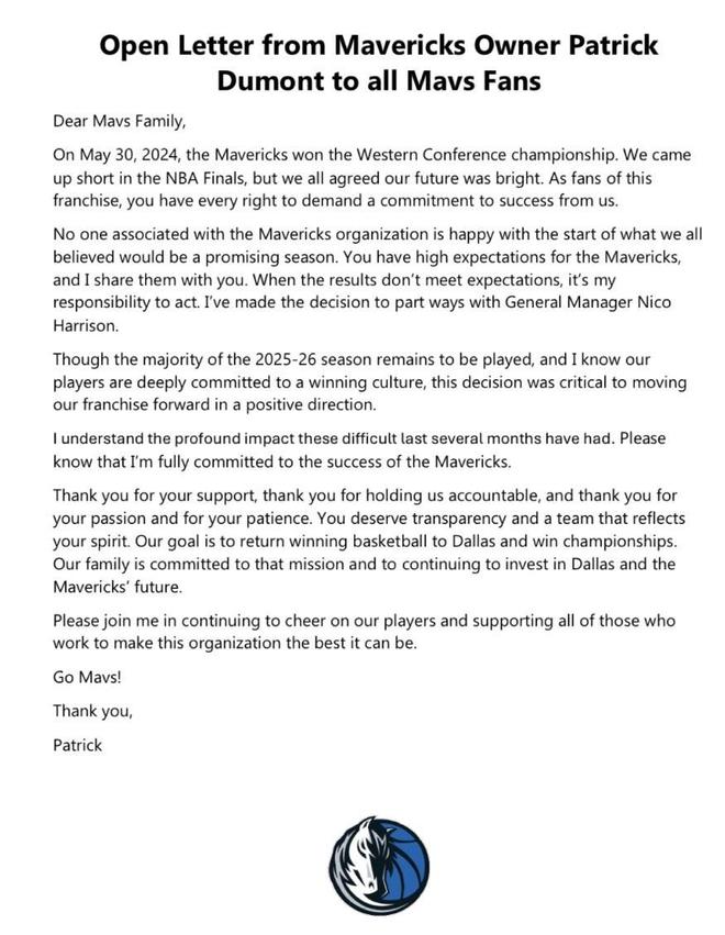 北京时间11月12日,独行侠官方发布公告,解雇了总经理尼科-哈里森。随后独行侠老板杜蒙致信球迷,呼吁球迷们继续支持球队。