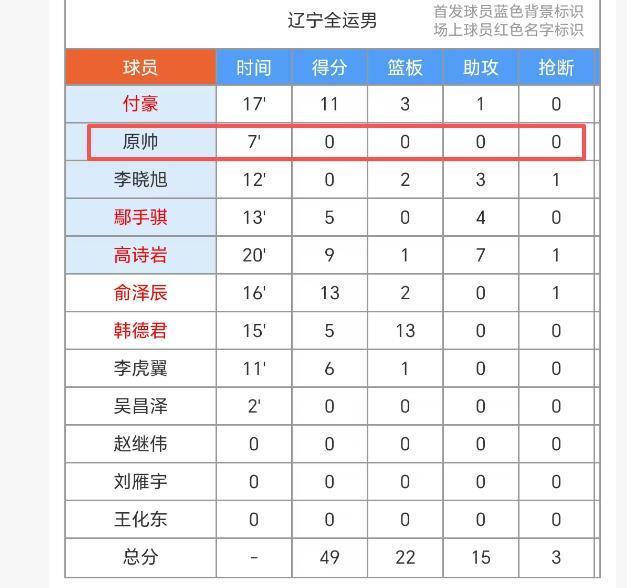 另一个原因就是集体发挥失常,在昨晚有抢眼表现的高诗岩、鄢手骐、吴昌泽都大为失色,玄冥二老就更不用说了,一个0分,一个5分。而表现最糟糕的就是顶薪球员、两届三分大赛冠军的原帅。他打弱队还可以,对着强队打高端局真不行。昨晚对战广东队全场只得到2分,今天更惨,一分不得。虽然杨鸣给他的时间不多,只打了7分钟,但也不至于一分不得,一个篮板也抢不到啊,真是辣眼睛了,最终原帅交出的数据是5投0中,0分0板0助0抢断,所有数据栏都是0,如果他和其他队员不是发挥太失常,这块铜还是有机会的。但糟糕的表现葬送了这块铜牌。