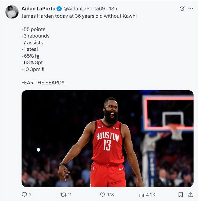 费城记者Aidan LaPorta在哈登拿到55分后写道:我简直不敢回想,费城竟然让哈登离开,然后用四年2.12亿的顶薪签下保罗-乔治。