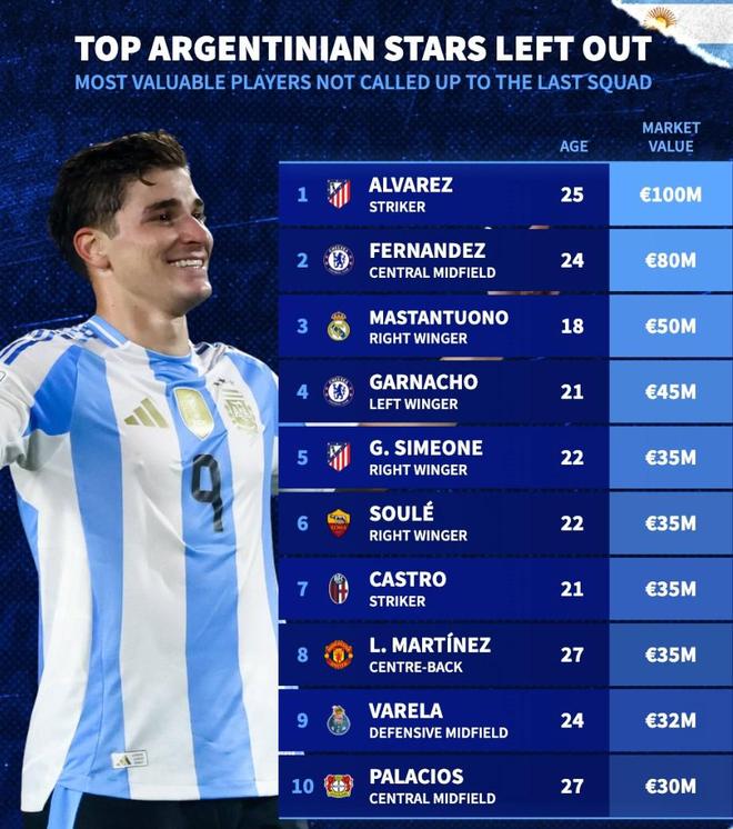北京时间11月15日,已经晋级2026年世界杯决赛圈的阿根廷队在一场友谊赛中客场2-0击败了安哥拉,与此同时,德转则统计出了此次未能入选阿根廷队大名单身价最高的10位球员,胡利安-阿尔瓦雷斯领衔,恩佐-费尔南德斯、马斯坦托诺、加纳乔、朱利亚诺-西蒙尼以及利桑德罗-马丁内斯在列。